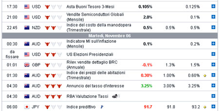 Il suo funzionamento è peraltro molto semplice: il calendario non fa altro che filtrare i dati provenienti da fonti certificate, raccogliendoli in un pratico layout che può essere consultato dal trader quando meglio crede. Questo layout, a sua volta, racchiude i seguenti dati: la data di pubblicazione, la data e l’ora di pubblicazione della notizia, la valuta che viene interessata dalla notizia, il grado di volatilità atteso (ovvero quanto quella notizia ci si aspetta possa influenzare i movimenti dei prezzi), il risultato precedente, il risultato previsto e il dato finale di effettiva chiusura.